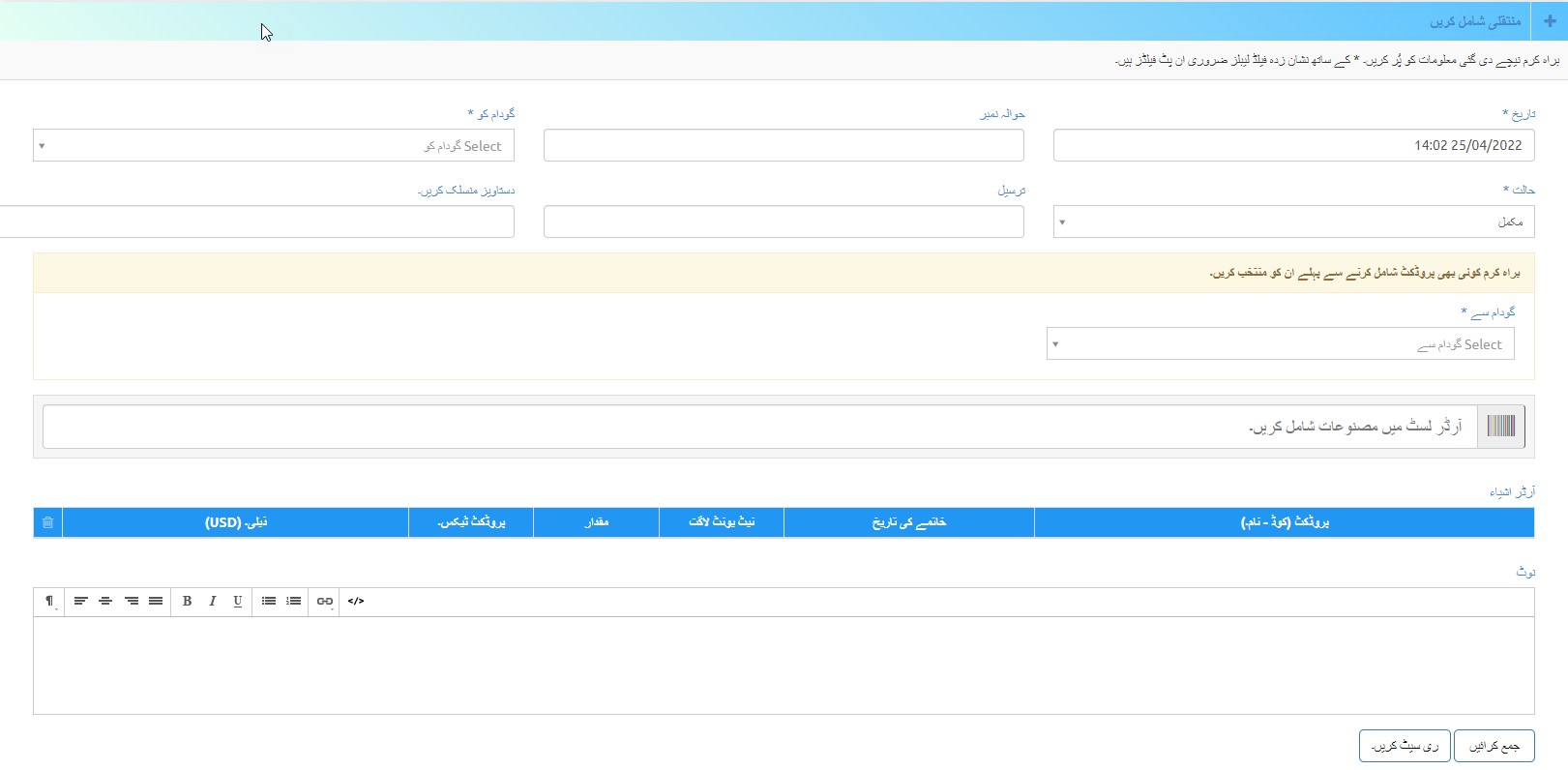 وئیر ہاؤس کے لیے: گودام کے ڈراپ ڈاؤن بٹن پر کلک کرنے پر، آپ وہ گودام منتخب کر سکتے ہیں جس میں آپ مصنوعات کو منتقل کرنا چاہتے ہیں۔