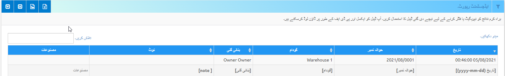 بزنس والا ہیلپ ڈوکومینٹرپورٹس ایڈجسٹمنٹ کی رپورٹس ایڈجسٹمنٹ رپورٹ بٹن پر کلک کرکے آپ گوداموں میں اپنی مصنوعات کی ایڈجسٹمنٹ دیکھ سکتے ہیں۔