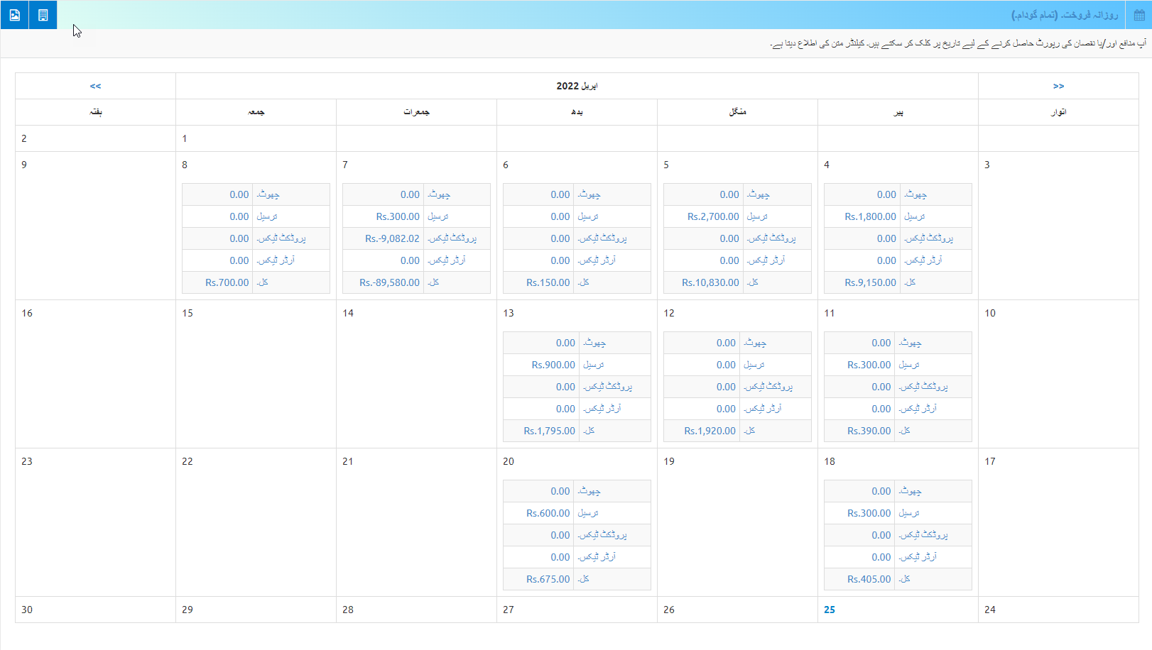 بزنس والا ہیلپ ڈوکومینٹرپورٹس ڈیلی سیلز ڈیلی سیلز بٹن پر کلک کرکے، آپ روزانہ سیلز رپورٹس دیکھ سکتے ہیں۔